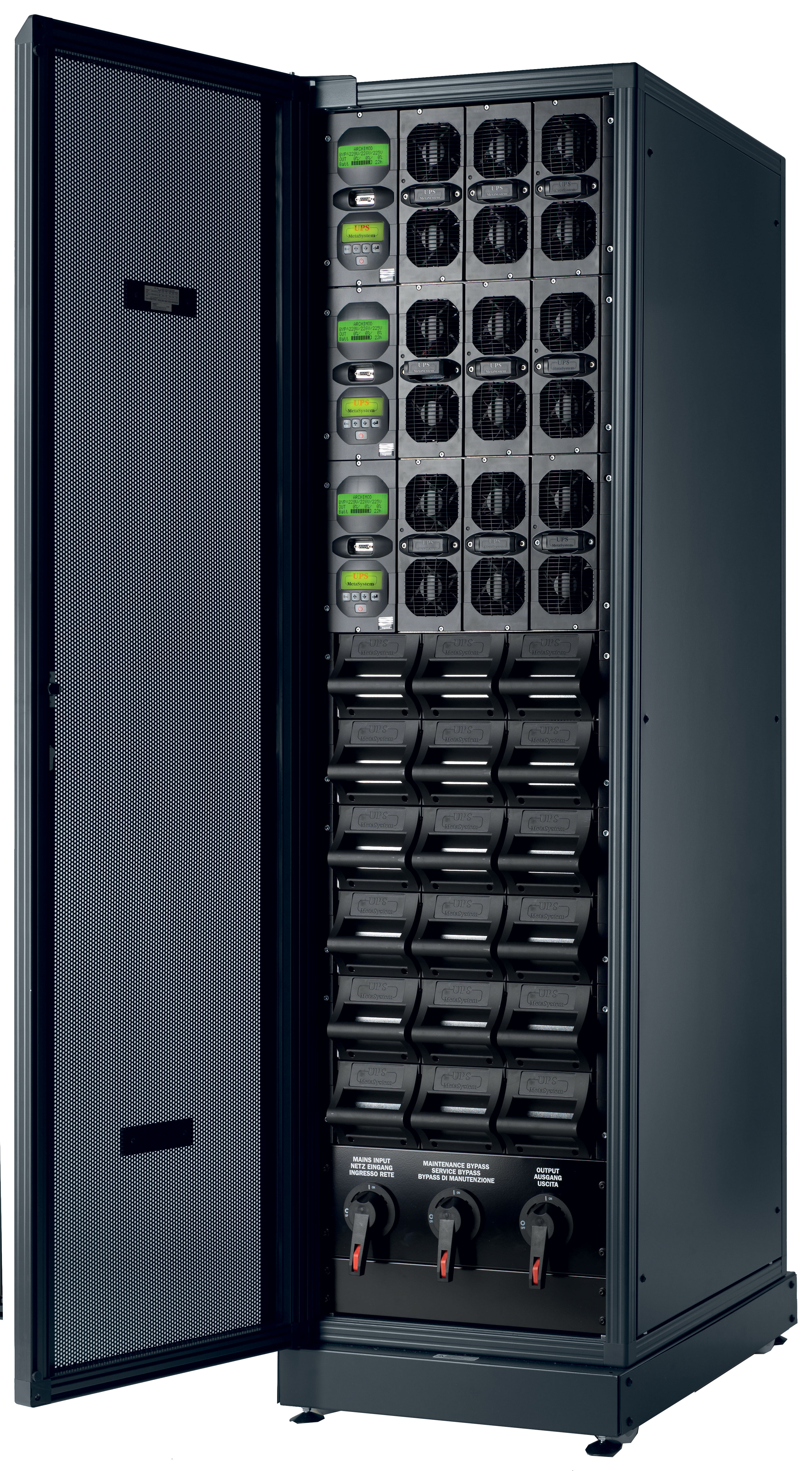 Redundância vertical:Reduz drasticamente os riscos de downtime através da configuração de redundânica N+X. Graças ao seu módulo de potência de 6,7kVA, é possível configurar diversos níveis de redundância sem prejudicar o footprint da instalação. |