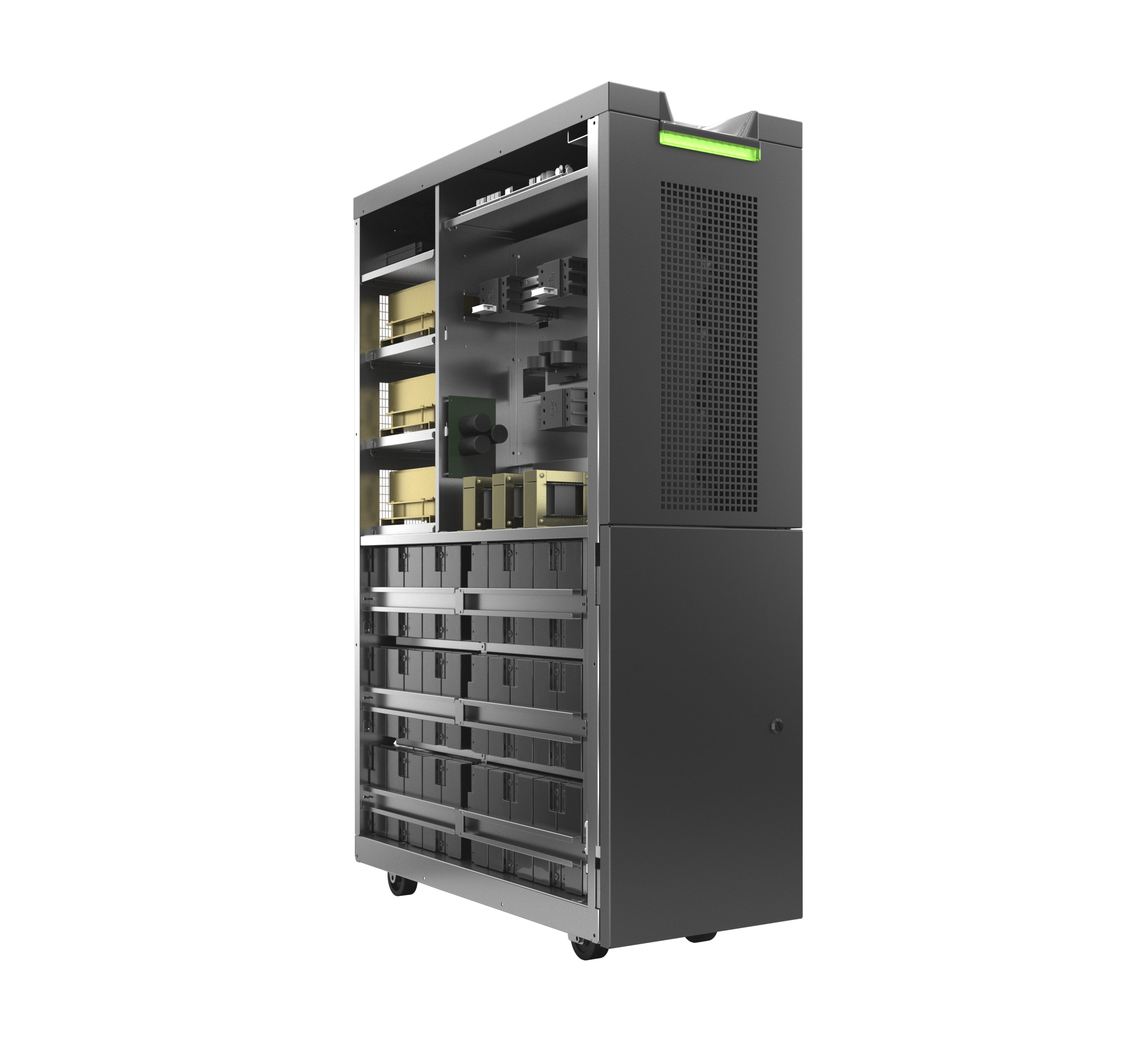 Menor footprint do mercado:Além de reduzir a área de ocupação do espaço físico, também reduz custos com gabinetes externos, permitindo quando necessário a instalação de baterias + transformador internos para adaptar tensão. |